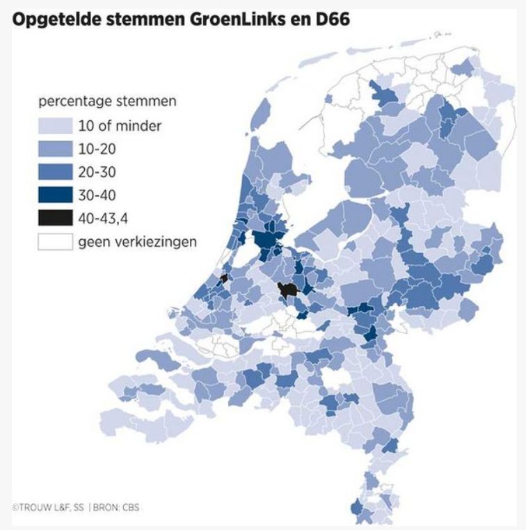 De scheidslijn blijkt anders te liggen. GroenLinks deed het behalve in in Amsterdam en Utrecht ook goed in andere universiteitssteden: de grootste in Nijmegen, Delft en Wageningen, op een haar na de grootste in Maastricht en Eindhoven. Dat duidt op een ander doorslaggevend gegeven: opleidingsniveau. Hoe meer hoogopgeleiden (hbo of wo), hoe groter de kansen voor GroenLinks en D66. Kijk naar de vier grote steden: in Utrecht is 51 procent van de bewoners hoogopgeleid, in Amsterdam 44, in Den Haag 34 en in Rotterdam 29.